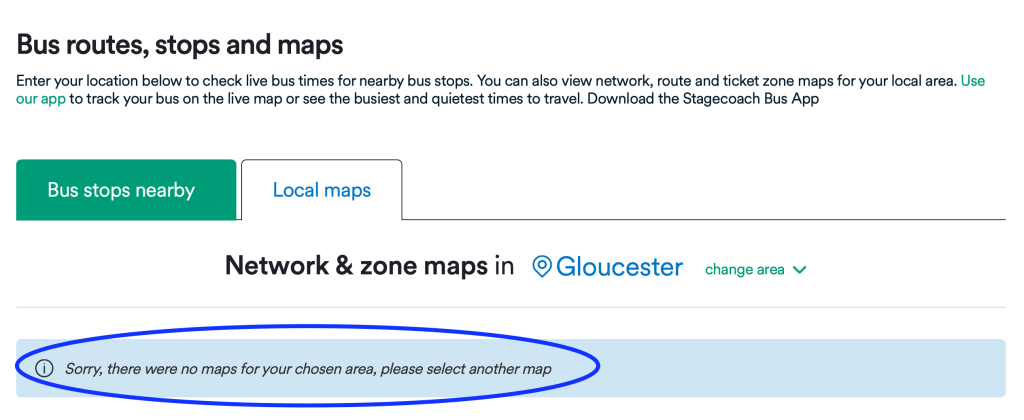 As of Monday evening when I’m typing this, that’s still the same message – and replicated for a large part of Stagecoach’s areas too. It would seem maps are either no longer regarded as relevant for Stagecoach or there’s a technical glitch with the website.