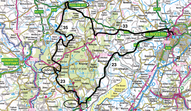 My last visit to this area had included memorable bus rides right through the centre of the Forest so this time I decided to skirt around it by using the hourly route 23 from Gloucester to Lydney along the southern boundary of the Forest which then continues north to Coleford; then change to the two-hourly 35 which runs from Monmouth via Coleford to Ross on Wye via a circuitous route along the western edge and return to Gloucester on the northern side on route 33 which runs hourly from Hereford via Ross-on-Wye to Gloucester. It all made for a very pleasant five hour round trip with two 35/39 minute breaks in Coleford and Ross on Wye.