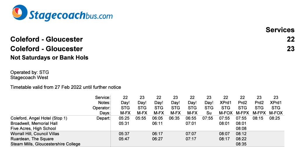 Unless you’re fortunate to find one of the few PDFs on the Stagecoach website which is in the printed-leaflet style, all their timetables UK-wide are in that ridiculous format and they all have the weird Day! code for every journey and the Period1/Period 2 rubbish.