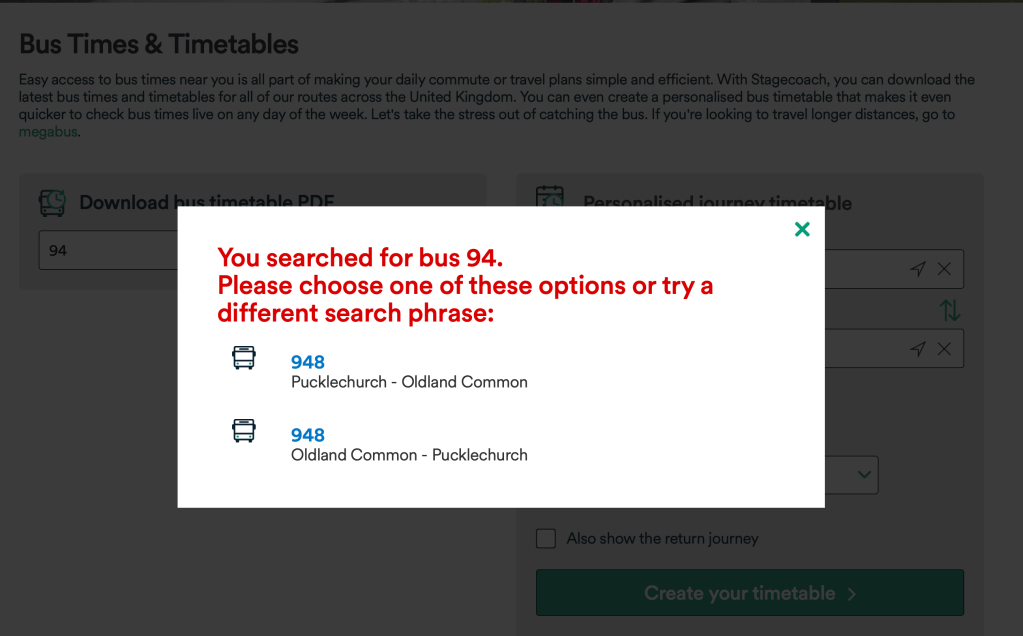 Luckily I recalled some route numbers from a previous jaunt to the Forest of Dean and together with some playing around with the Journey Planner I was able to get the timetables I needed, but it was a hugely frustrating process.