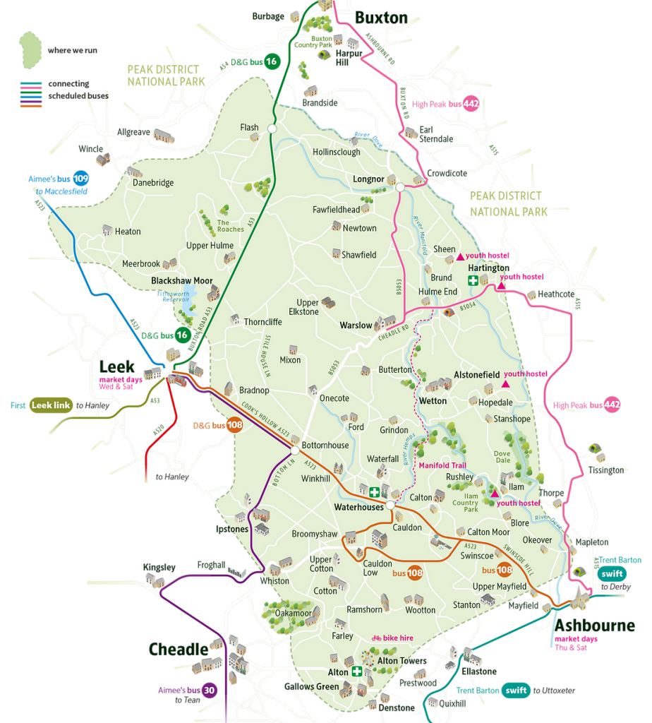 The area covered by Moorlands Connect extends north from Ashbourne to Buxton (both in neighbouring Derbyshire) and over to Leek encompassing a lovely part of the Peak District National Park and numerous small isolated villages and hamlets making it typical of the new breed of deep rural DRT schemes now being introduced.