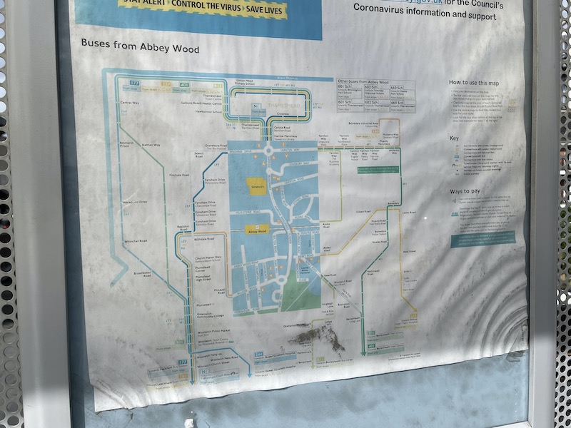 …. and over at Abbey Wood the sorry state of the out of date spider maps in the bus shelters by the shiny revamped station remained as appalling as they’ve been for years.