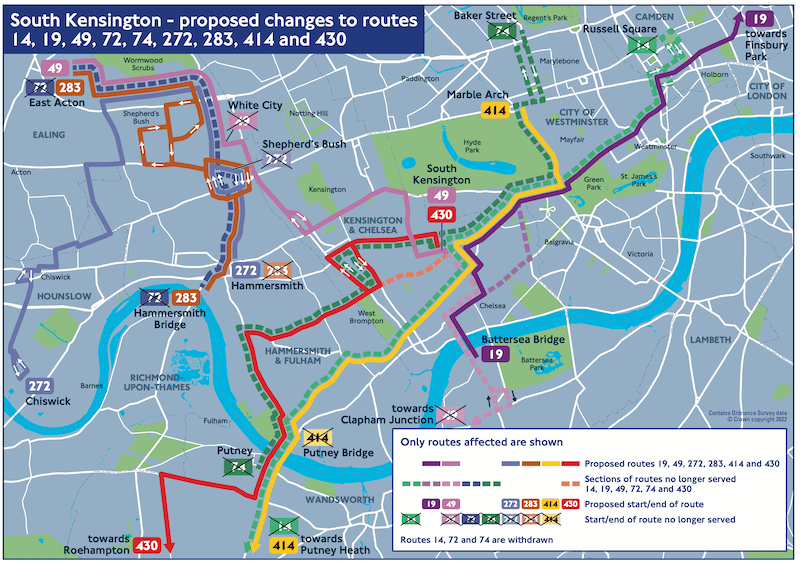 That’s why route 19 is rerouted via South Kensington instead of Sloane Square; route 49 is cut back from Clapham Junction to South Kensington and route 430 is diverted via Earls Court and Cromwell Road. And as a consequence it’s goodbye routes 14 and 74.