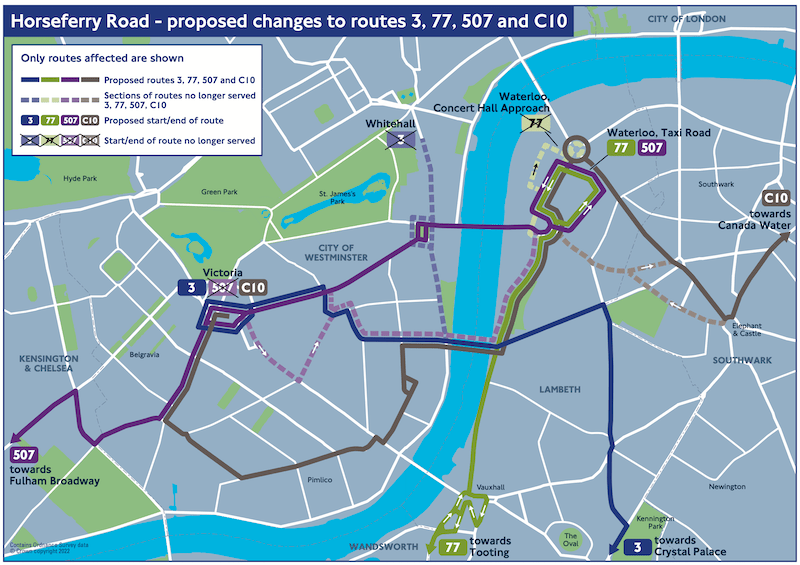 One other minor change highlighted on the Horseferry Road map above is route 77 changing its terminal point at Waterloo Station so it’s closer to the station building itself, which makes some sense.