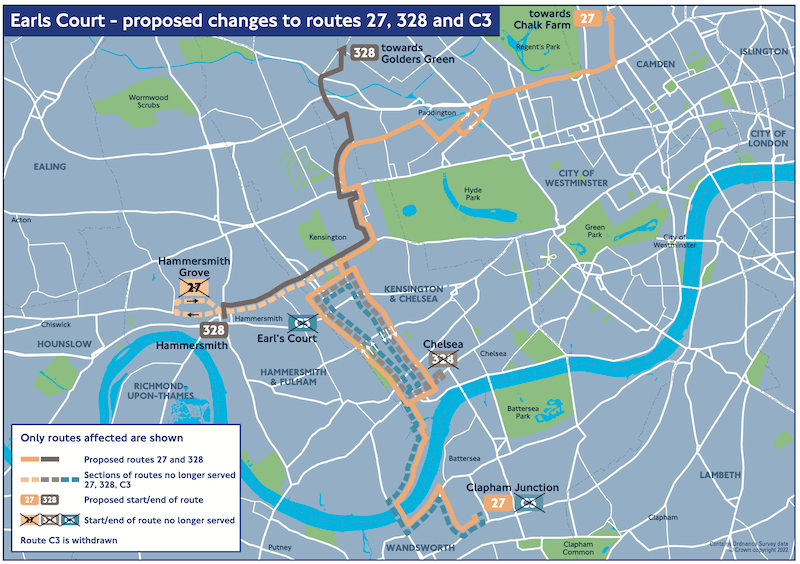 As the map above shows route C3 (light green-grey) will be replaced by a diversion of route 27 (light orange) away from its existing route to Hammersmith to take over the C3 instead, as well as route 328 (grey) being diverted away from Earls Court and Chelsea Worlds End to Hammersmith instead.