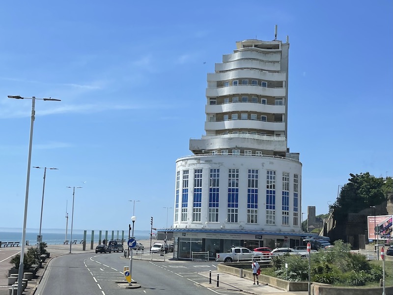 …. and arriving there is marked by the eye catching Marine Court – designed by Kenneth Dalgleish and Roger K Pullen with overt references to the Cunard White-Star Line Queen Mary which entered transatlantic service in 1936….