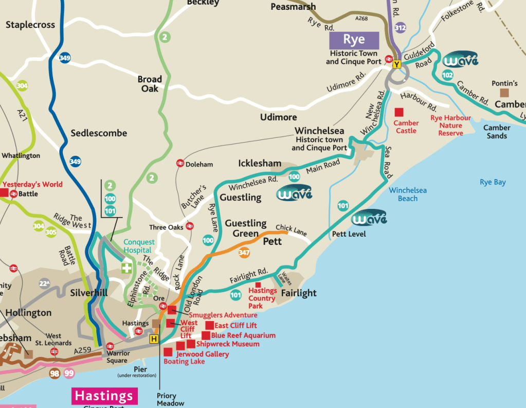 Buses between Hastings and Rye take partly different routes but both start at Conquest Hospital to the north of the town before short route variations to Silverhill and then run together to the bus station conveniently sited right alongside the railway station before continuing via Old London Road to Ore where they diverge. Route 100 runs hourly inland via Guesling and Ickelsham while route 101 also runs hourly but via the coastal road through Fairlight, Pett Level and Winchelsea Beach.