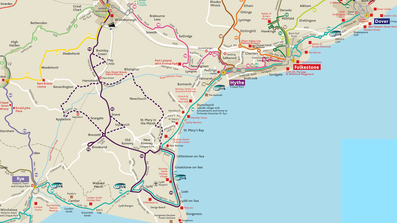 As the map shows this “Wave’ branded route operates via Camber, Lydd, New Romney, Hythe, and Folkestone.