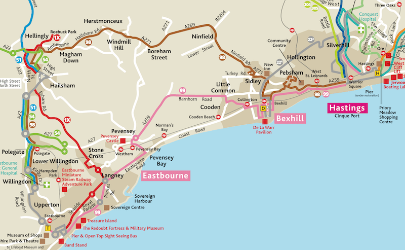 Having had my appetite wetted for scenic seafront journeys I decided to continue Riding the Wave eastwards and take a journey on Stagecoach’s route 99 through Bexhill, Little Common and Pevensey to Eastbourne – the one in pink with no ‘Wave’ branding on the map.