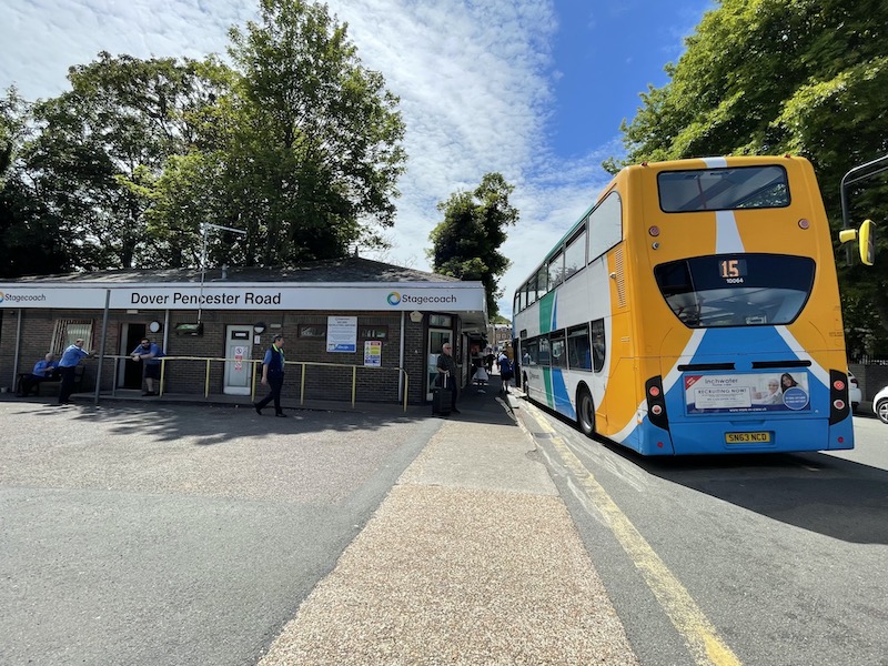 We changed drivers in Folkestone where most passengers alighted – just two on the upper deck travelled through – and after a five minute break we were on our way on the final leg taking just over half an hour to Dover with a reasonable number of passengers on board. We arrived in Dover’s Pencester Road terminus a couple of minutes ahead of the 13:31 scheduled arrival.
