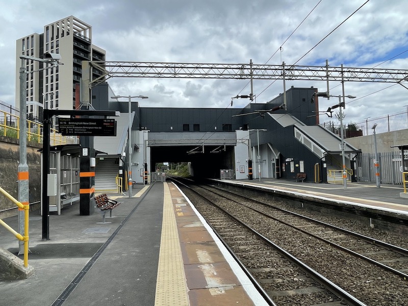 That Perry Barr station building just looks rusty to me! I guess the yellow crosshatch markings on the open air footbridge are there to try and prevent people bumping into what look like lighting shades protruding at shoulder level on the wall.