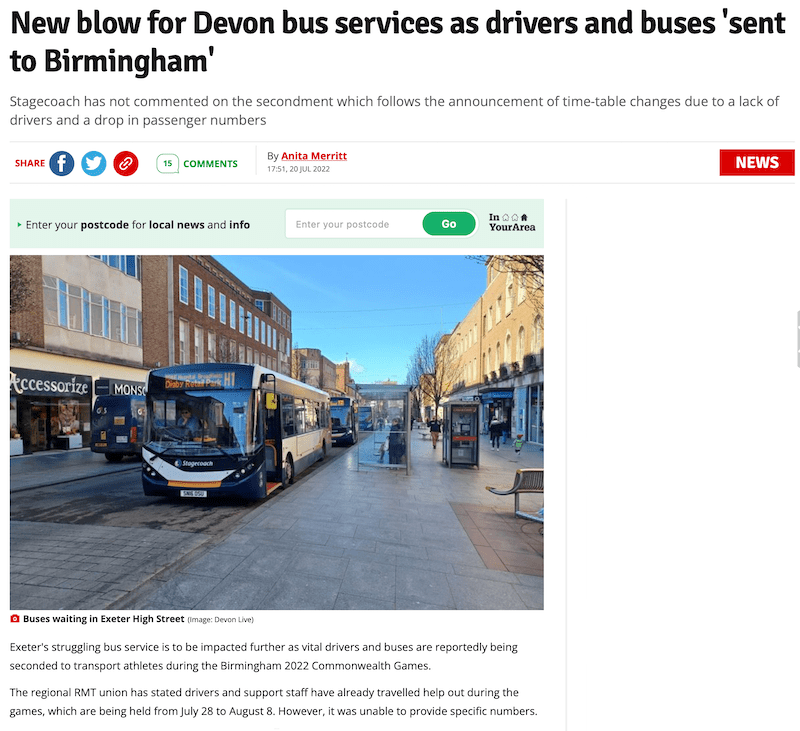 Stagecoach was already struggling in Exeter, with a sudden loss of drivers a while back, and now their loan of drivers and buses to CWG is being reported locally.