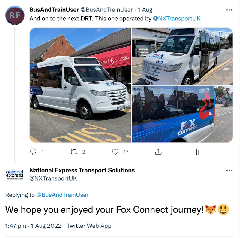 So a big shout out for excellent customer service to Michael, Brett and the person overseeing the social media feed. I was very impressed to receive two phone calls from Brett giving me updates as well as receiving direct messages on Twitter. I’d already been impressed that NatEx Transport Solutions had followed up my tweet about making a journey with an enquiry asking how it went. This is very unusual for big companies these days where many comments are met with complete silence or banal impersonal replies. This was a very welcome exception.