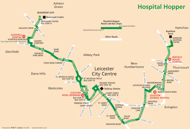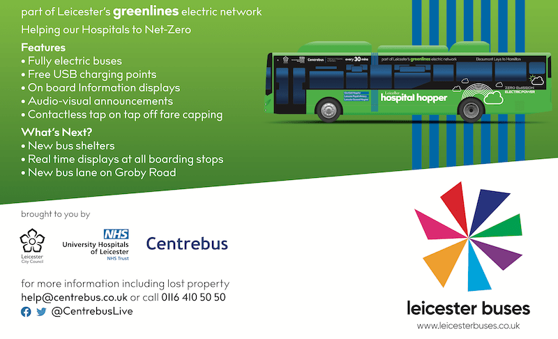 This service is operated by Centrebus. It runs half hourly and as the branding implies links Leicester’s three main hospitals (Royal Infirmary, General and Glenfield) as well as the Nuffield Hospital ….