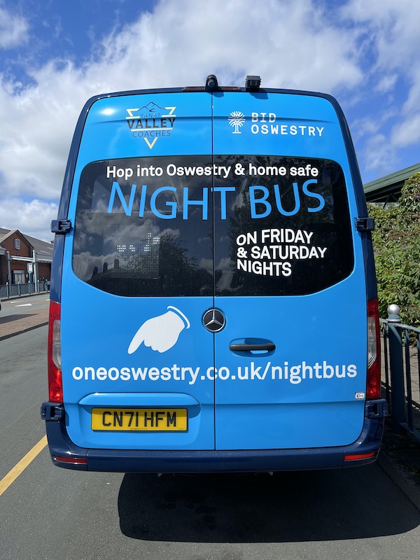 Also, for a town the size of Oswestry, it’s impressive to see the provision of what’s called a “Night Bus” on Friday and Saturday nights except it’s more an evening and late evening service with six hourly journeys from 19:30 through to 00:15 doing a 30 minute round the town trip. It looks as though its funded by BID Oswestry – the Business Improvement District for the town which local businesses will be funding.