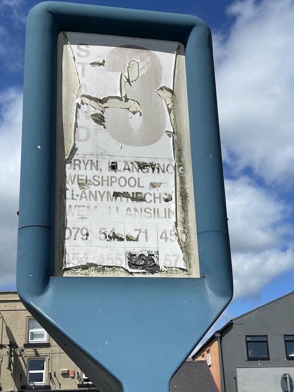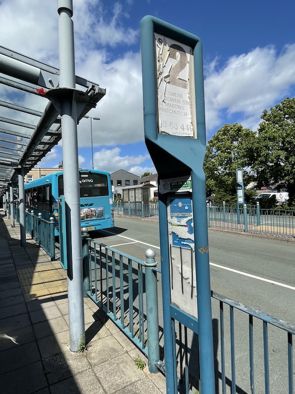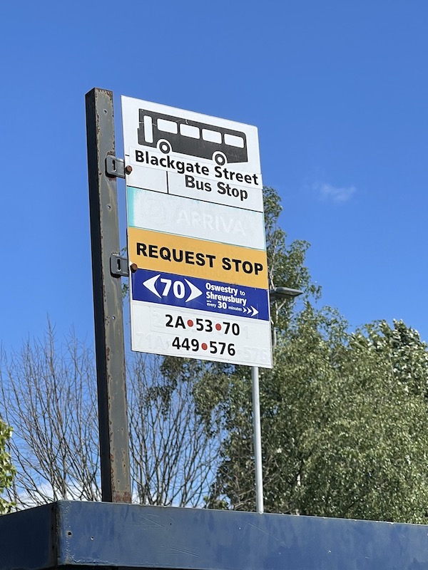 The bus stop flag proudly proclaims route 70 linking Oswestry with Shrewsbury….
