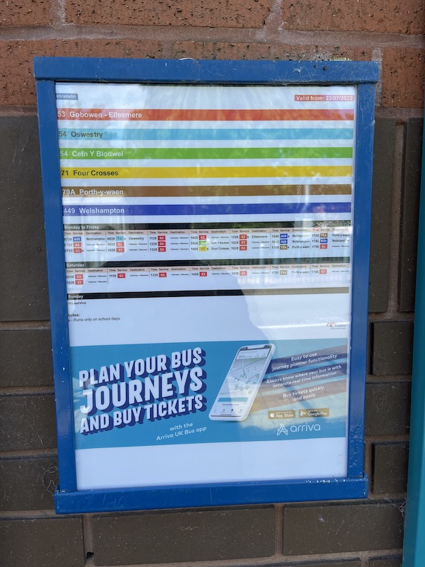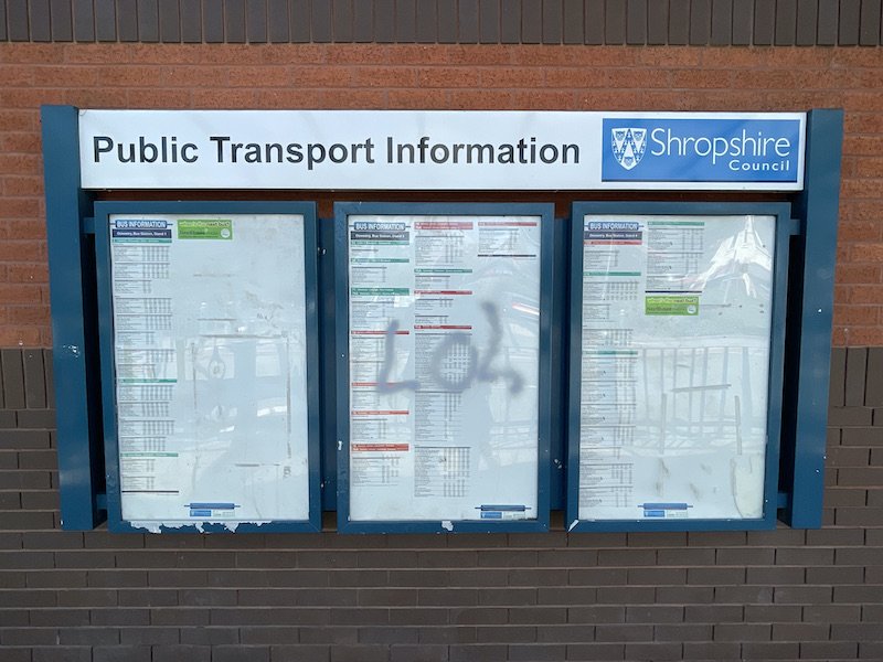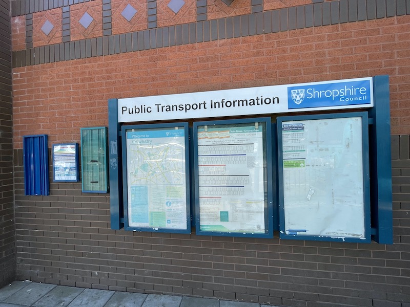 There’s another display showing rail timetables for Gobowen which is all very impressively multi-modal until you look more closely and see they’re dated May 2015. Let me just write that again. Rail timetables dated May 2015 are on display at the town’s bus station. Shame on you Shropshire Council.