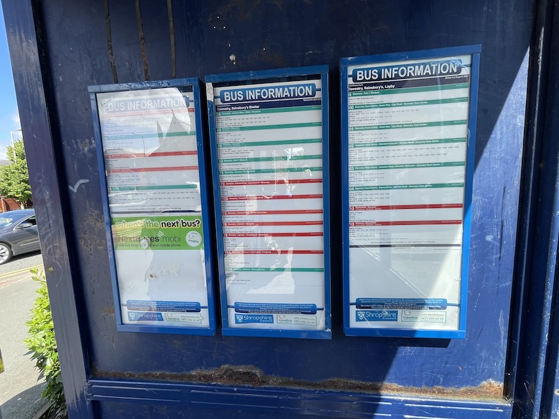 For some years after deregulation the then Shropshire County Council had some good publicity on offer, but it had faded away by the millennium. Today’s unitary Shropshire Council has to be one of the poorest councils at public transport information, abdicating online information to Traveline and as Roger has seen doing very little regarding roadside provision.