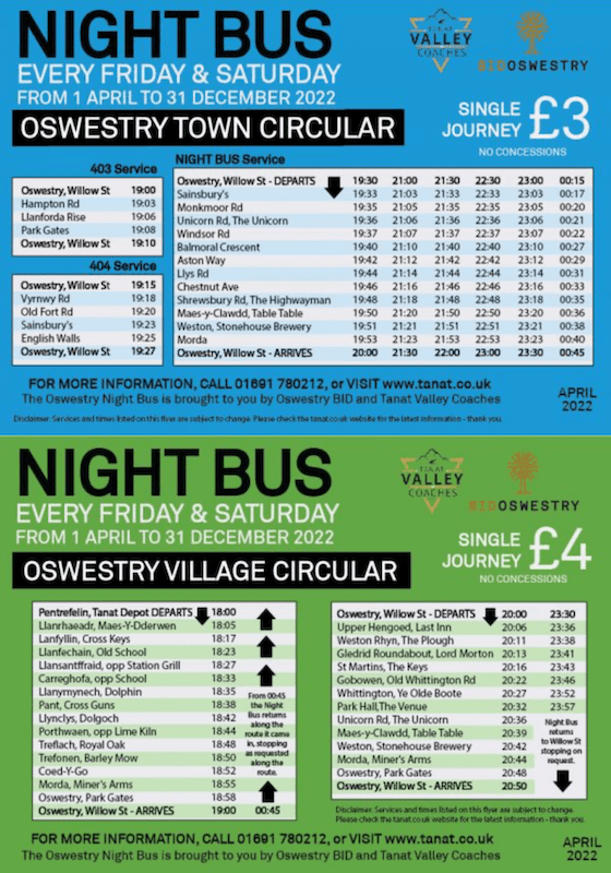 And it doesn’t end there. There’s also an “Oswestry Village Circular Night Bus” providing four circular journeys taking an hour 18:00, 20:00, 23:30 and 00:45 also on Fridays and Saturdays.