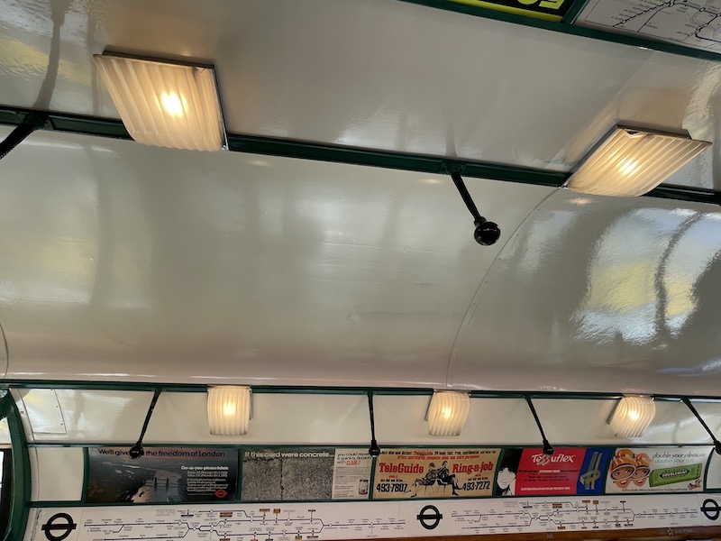 Inside the train are authentic advert panels as well as original line diagrams from the Northern line reminding us that central London stations have been renamed over the years (Strand and Charing Cross).