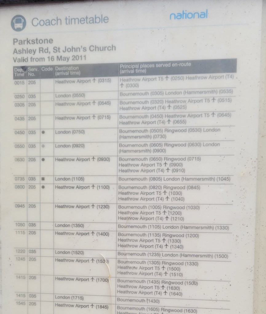 …. while the timetable and fares expert Barry Doe told me he’d spotted this 11 year old timetable showing well out of date National Express express coach departures in Parkstone.