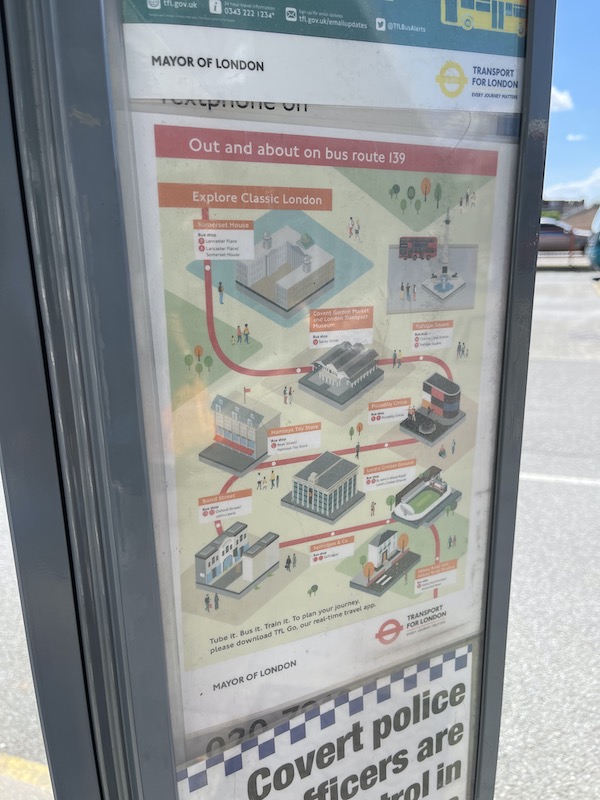 …. of finding a similar mini poster in a timetable case on the bus stop for bus routes heading down the A10 promoting the tourist delights of “Classic London” available from a ride on route 139 between Waterloo and Abbey Road 15 miles away.