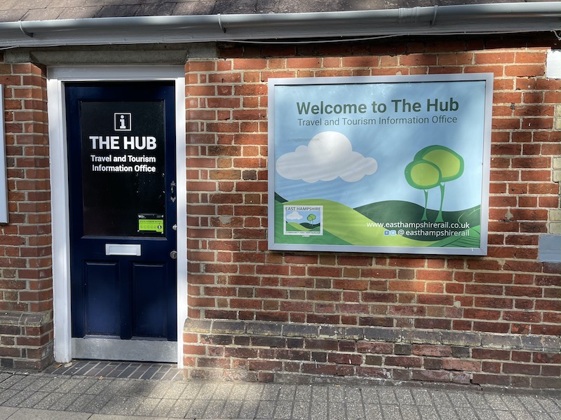 Over in Petersfield station I was impressed to see the station’s former ‘parcels office’ has been repurposed as a ‘Hub’ for community use as well as a Tourism Information Centre in the summer. This is an excellent and valued resource for the local community being also used for distributing food, groceries and toiletries (obtained from supermarkets, farms and community gardens) on Wednesdays, Fridays and Saturdays as well as school uniform on a recent Thursday. Also, “knowledgeable and helpful volunteers staff the Hub every Thursday to Sunday between 1000 and 1200 with information available on train and bus services, local walks, cycle rides and attractions so that once visitors arrive in Petersfield, they will have many diverse opportunities to explore the area”. Fantastic. Sadly it was closed on the recent public holiday so I was unable to see inside.