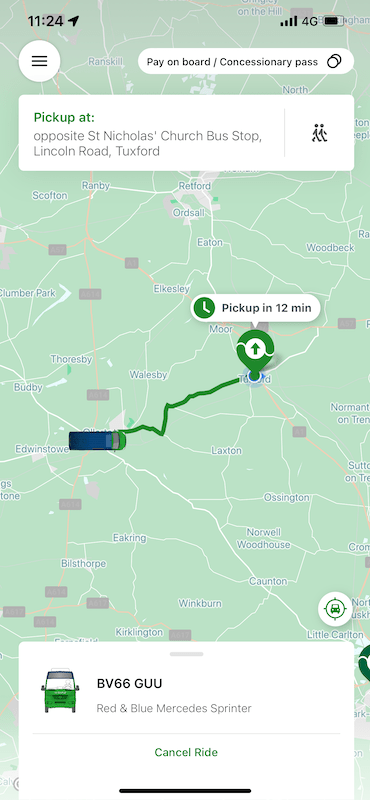 Interestingly I tried again to book a journey and this time specified Newark North Gate railway station as my destination (not directly served by route 37, although it’s just a short walk away) and it gave me an offer of a ride within 12 minutes so I booked that and waited.