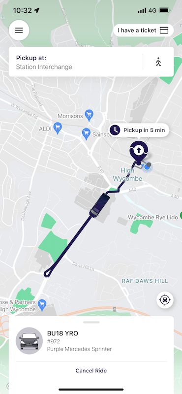 Guessing it would be easy to book ‘on demand’ rather than in advance I left it until my train was pulling into High Wycombe at just before 10:35 before booking my first ride from there to the large Asda supermarket south of the town. Sure enough a ride was offered in five minutes …