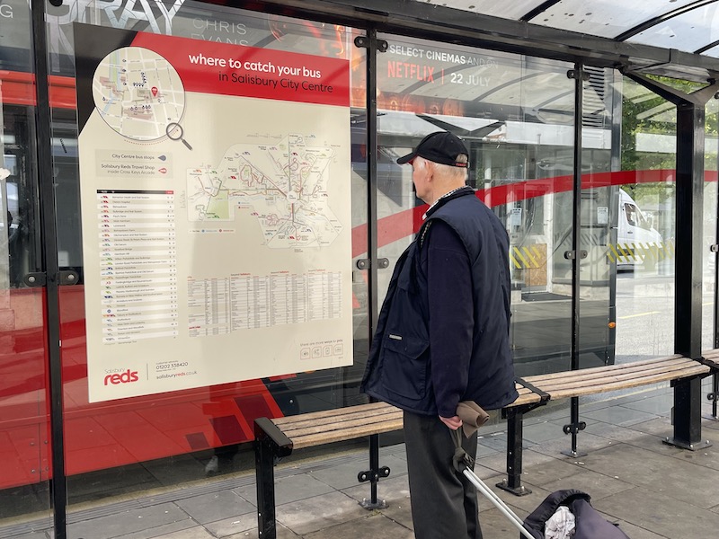 Bus stops in the city centre have some of the best information displays you’ll find anywhere. It’s a feature of the Go South Coast area. There are clear posters on the outsides of bus shelters advising which route stop there….