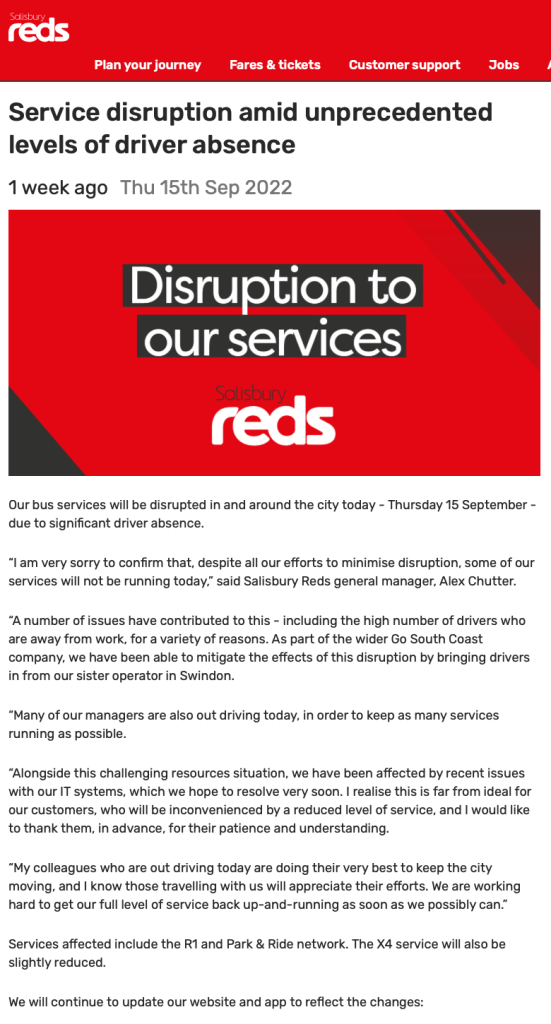 We also hope eventually to an uplift in service levels once driver availability is restored. Salisbury Reds do try hard against such an infrastructure. It really needs more support from all