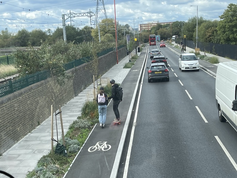 …. as a pair of skateboarder and electric scooter riders take advantage of the cycle lane….