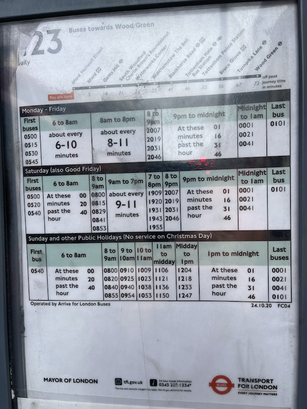 We hit the traffic queue for Turnpike Lane at 12:23 and arrived at the final bus stop in Wood Green High Road at 12:35. The scheduled time is six minutes for that journey. Our scheduled arrival should have been at 12:26.