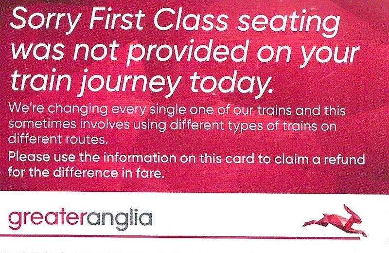 Greater Anglia has invested in an impressive new fleet of trains including the rather nice Class 745 which offer first class seats on the Norwich to Liverpool Street service. A problem arises when one of these trains is unavailable and substituted by one of the same class but as used on the Stansted Express which aren’t fitted with first class, nor tables.