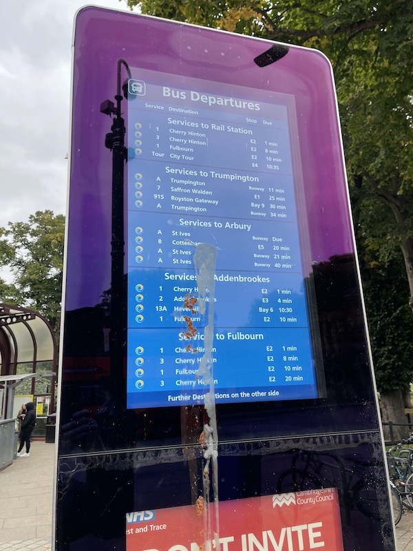 This real time display on a totem alongside Cambridge bus station has bus information on both sides…