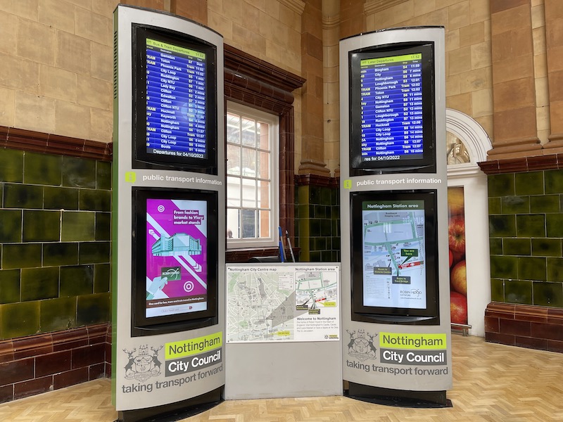 It’s always a pleasure to visit Nottingham by train and see the great displays in the foyer about onward travel by bus but I was a bit surprised on my recent trip to see the leaflet racks are now in the outside hall some distance from the real time departure screens.