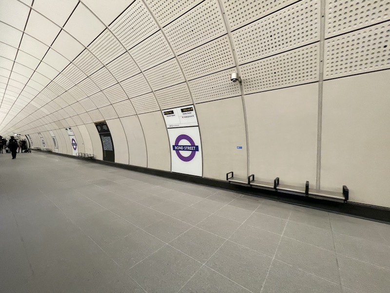 Like other Elizabeth Line central area stations, Bond Street’s subterranean extent is truly vast and includes contingency space on the platforms for longer trains at some time in the future as well as the station having the now familiar separate entrances/exits at either end of the platforms.