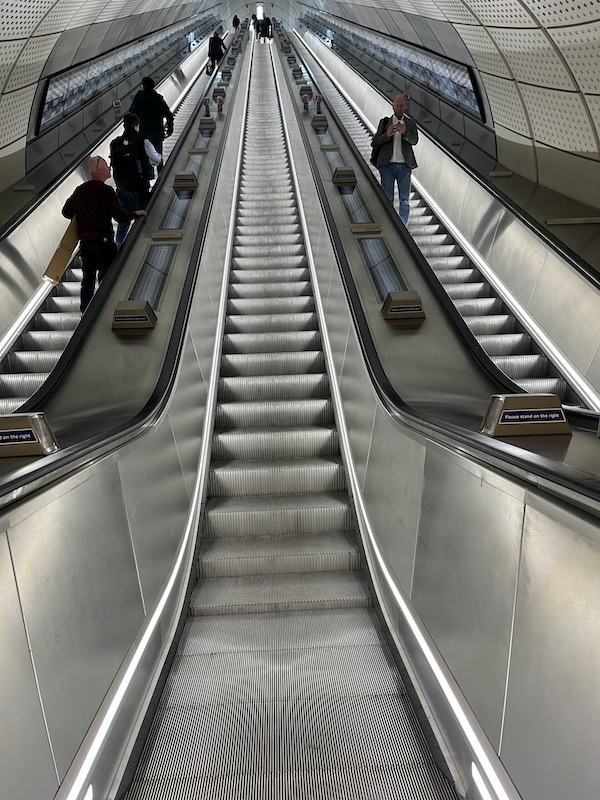 Once through the gates at Hanover Square, while it may be short on distance at street level, there’s a very long escalator to take you below ground. At 60 metres I’m told it’s just 1 metre short of the record holding Angel Underground station 61 metre installation.