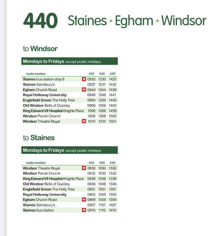 The timetable comprises just three off-peak return journeys on Mondays to Fridays between Windsor and Staines via Old Windsor, Englefield Green and Egham.
