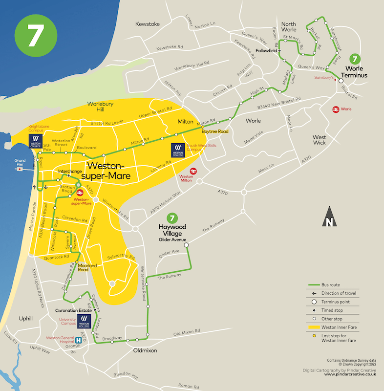 Both routes serve Worle to the east of the town but by different routes. Route 7 is definitely the main route for the town for busyness. It runs every 20 minutes.
