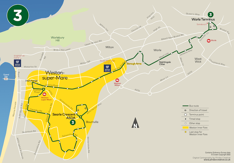 Route 3 is operated by single deckers and links Worle with the town centre and on to a large Asda at Searle Crescent.
