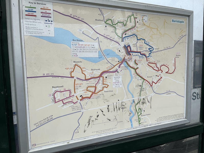 What the bus station lacks in passenger comforts it makes up for with a couple of very helpful Devon County Council produced maps displayed at the departure stands as well as full timetables.