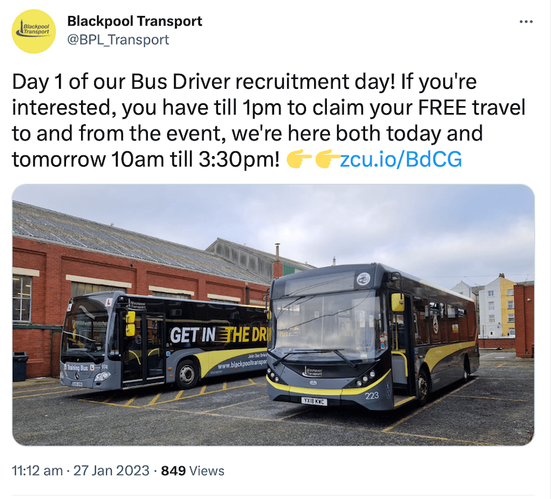 It’s also good to see Twitter being used by staff based in the town (not all bus companies follow such a policy) with regular messages advising of any operational issues. These last few days has also seen messages promoting the company’s Recruitment Day held yesterday and today. And you get free travel to and from the event – worth turning up just for that!
