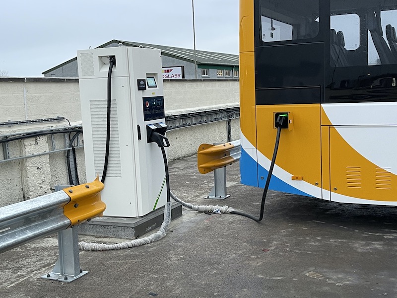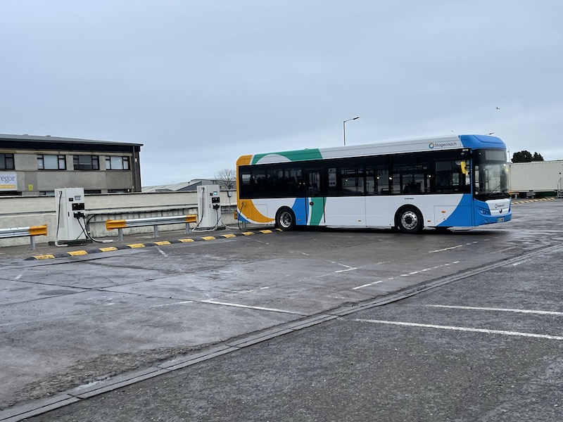 13 double headed charging points have been installed around the edge of the large parking area at Stagecoach’s bus depot in Seafield Road enabling all 25 buses to be plugged in as they return to depot after a day’s work.