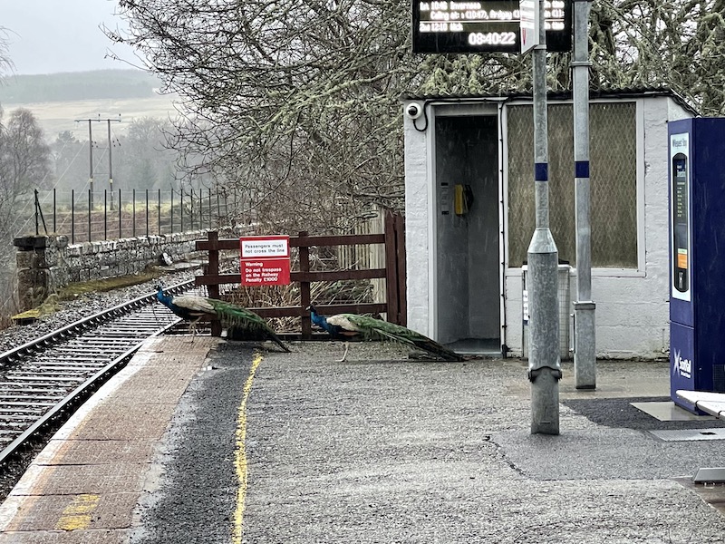 We got the first train of the day at 07:00 from Inverness to Invershin for the 98 minute journey and on arriving found two fine looking peacocks enjoying a rest in the small cabin style waiting shelter …
