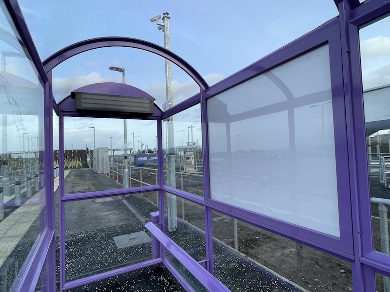 Buses on routes 11 and 27 call by the station and do a circuit of the car park with a bus stop and shelter alongside platform 1. Unfortunately HiTrans (who look after bus stop displays) hasn’t yet got round to installing any bus departure information in the shelter which isn’t going to encourage passengers to make a connection between bus and train rather than attempting the walk. The real time sign in the shelter was also blank.