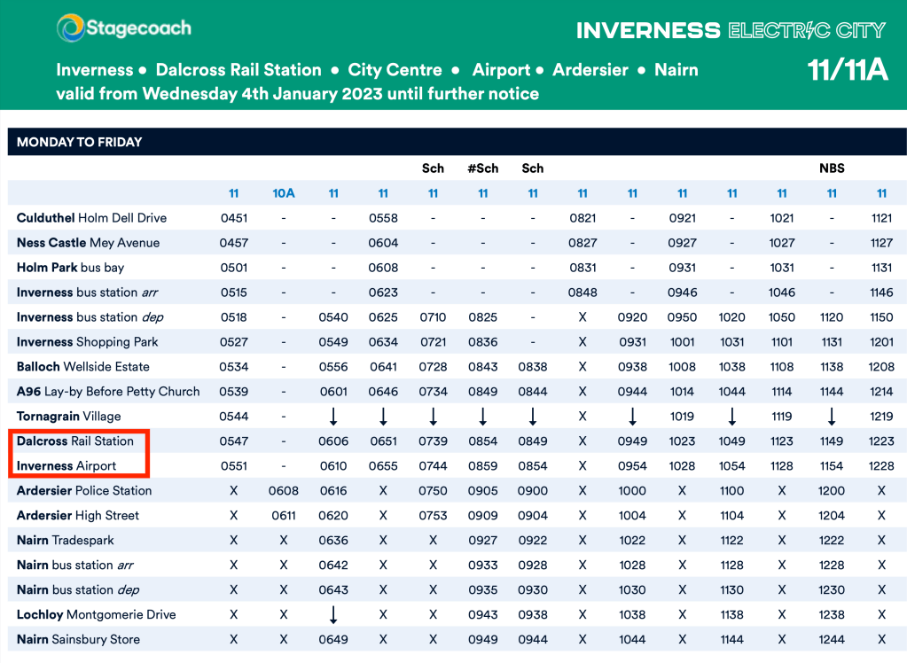 The online timetable for service 11 is part of one long pdf which includes all the other Inverness city routes in numerical order, so you have to know to scroll right down through routes 1, 2, 3, …. and 8 to get to 11.