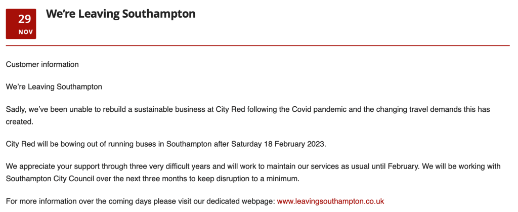 First Southampton bus services will stop running in Southampton from Saturday 18 February 2023. – CityRed will stop on 18th Feb, First Solent (the X4/X5 to Portsmouth & Gosport via Fareham) will still continue to run after then.