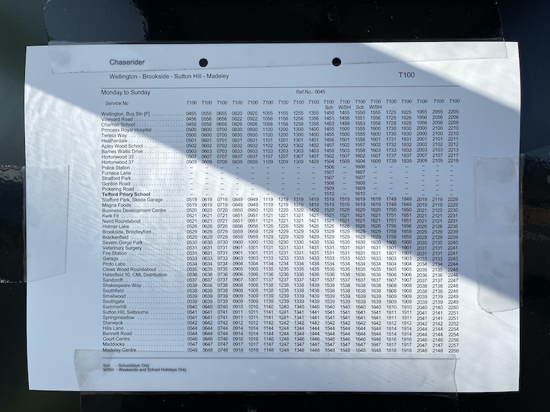 First up is route 100 financed by Telford & Wrekin Council. This hourly service operated by Chaserider was rather oddly introduced in the week before Christmas on 19th December, so has had a couple of months to bed in and attract passengers.