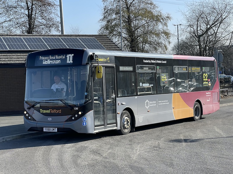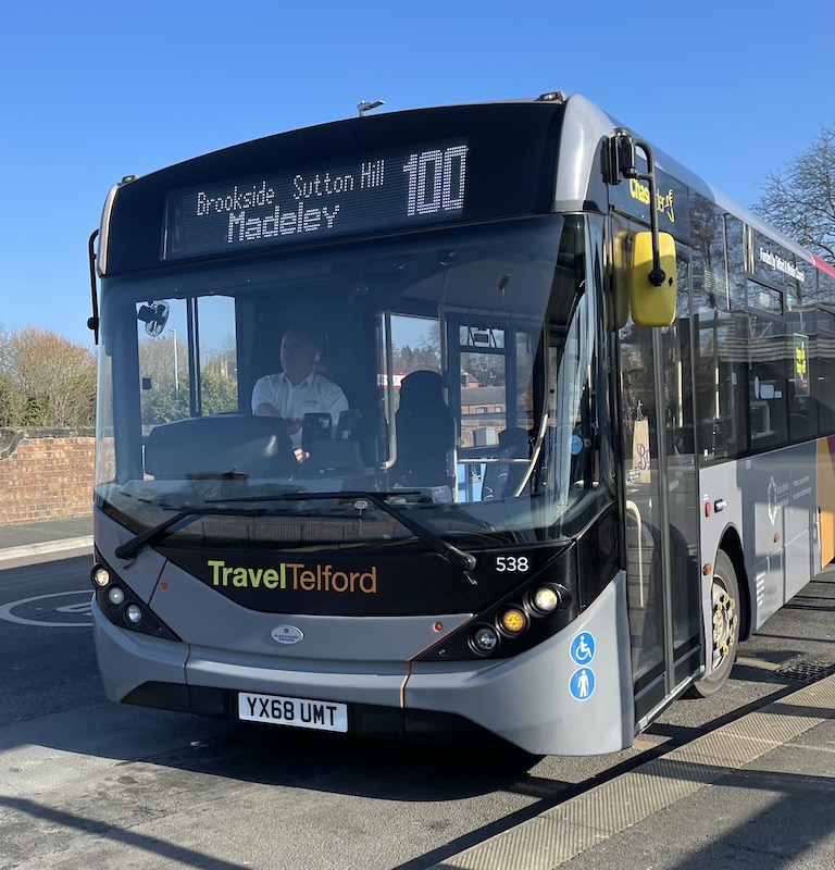 The bus carries a Travel Telford brand name which is also evident in some bus shelters ….